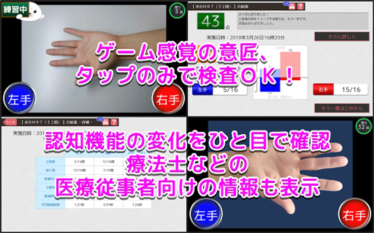 「手のメンタルローテーション課題:初級」は、ゲーム性のある楽しい検査で脳機能(認知機能:「ボディ イメージ」)を測定することができます。