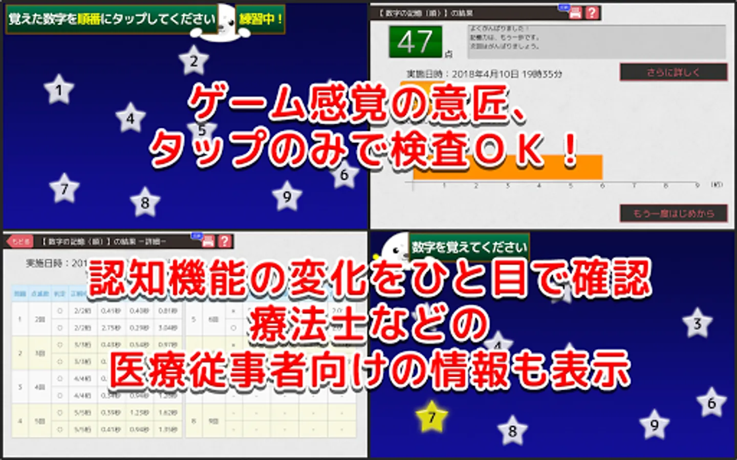 紙上で行われている認知機能評価「Tapping Span」を参考に開発した認知機能評価アプリです。
