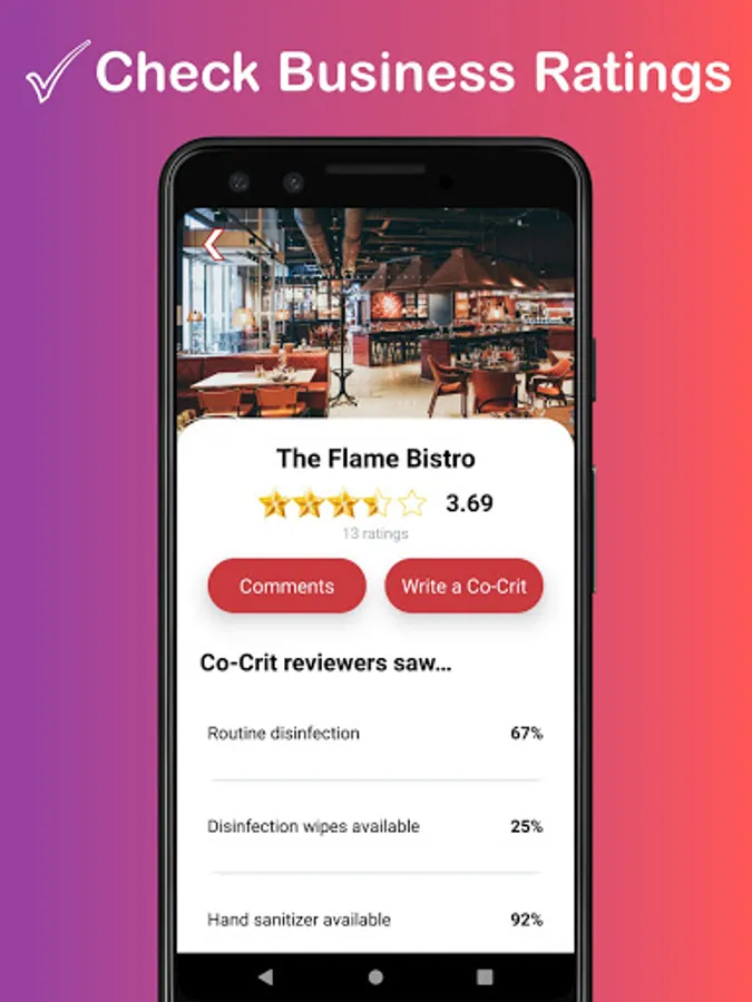 Stay safe with Co-Crit! Read and write reviews and comments for any business to make more informed decisions when you go out. With all excess proceeds donated to Feeding America, help businesses and those in need by using Co-Crit!
