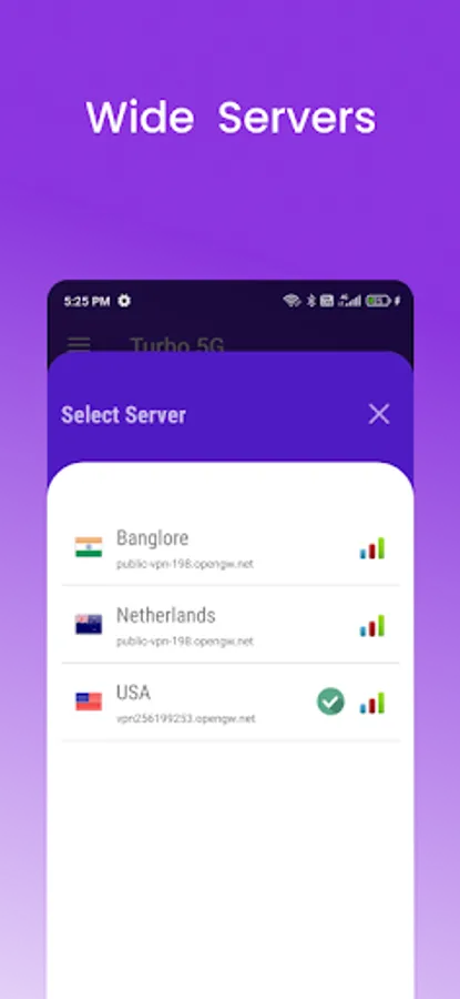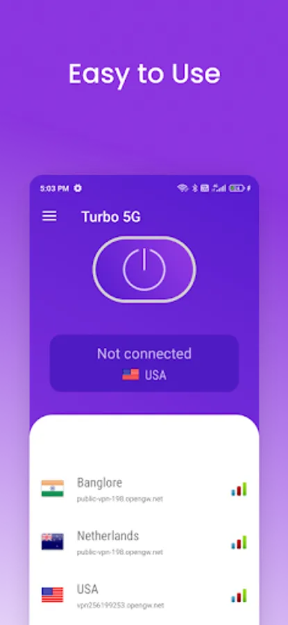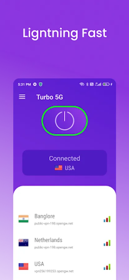 5G TURBO VPN provides the fastest VPN server for you with the smart connection algorithm. All you need to do is just one tap.