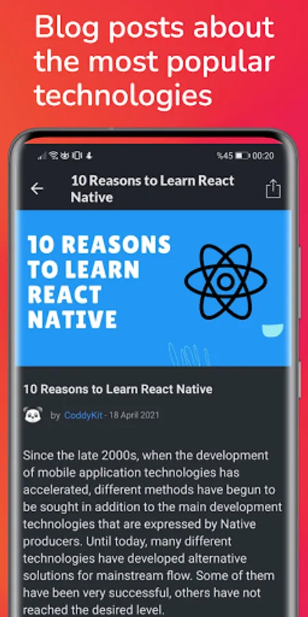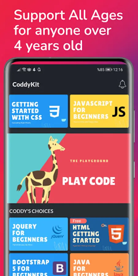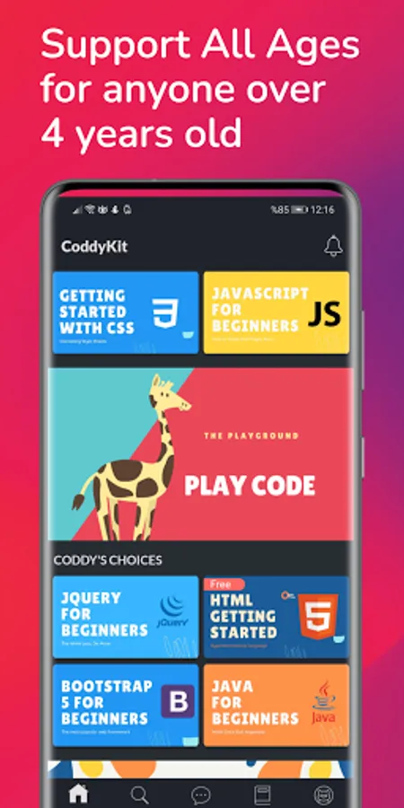 CoddyKit teaches the basics of software development and many modern programming languages and technologies such as Javascript, Java, Bootstrap 5, or Python 3. You can access the list of courses in the courses section. Or you can go to the Play page and talk to Coddy to find the most suitable courses for you. It's free learning app for learn programming.