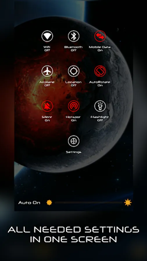 1) First screen with quick settings such as wifi, bluetooth, flashlight etc.