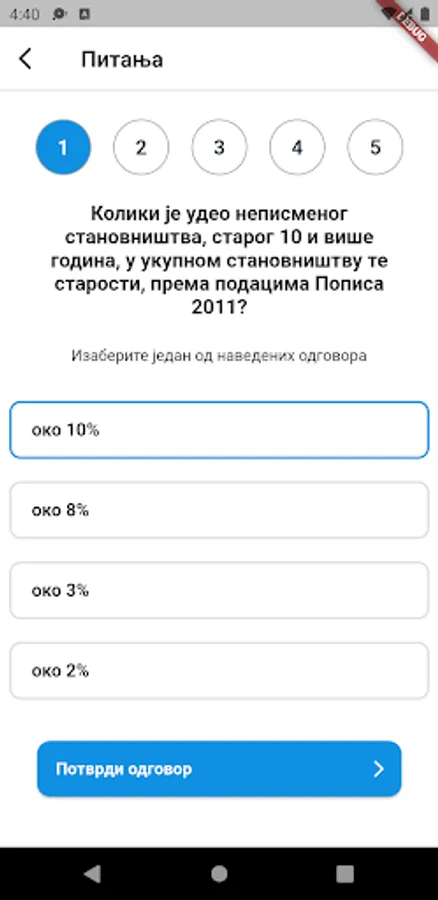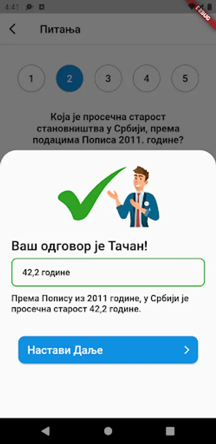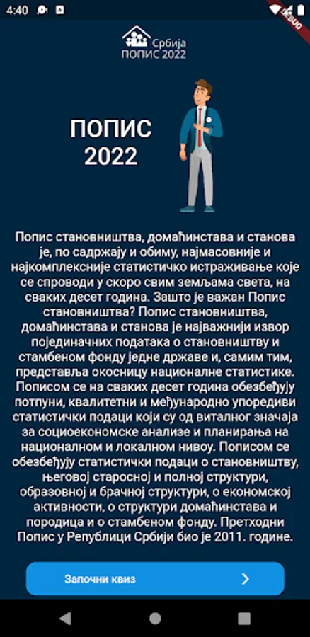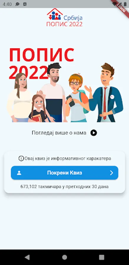 The application is primarily intended to educate the citizens of the Republic of Serbia about important statistical data. The mobile application is divided into two different activities. One of the activities is an interactive quiz, in which the user gets 5 questions and 4 offered answers, at the end of the quiz users get their result, which further motivates them to do the quiz again. The idea was to educate citizens through interesting activities, such as quizzes, which can be played by all members of the household.