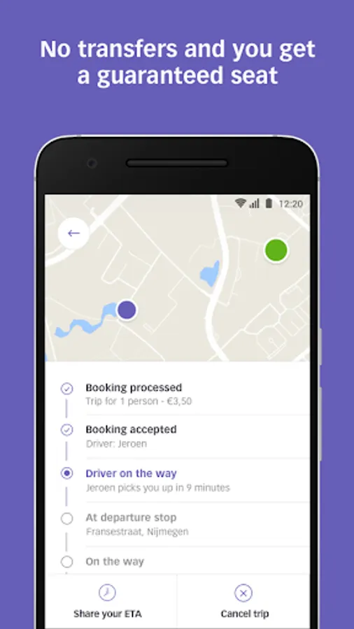 You can order your journey via the free OV flex app. Enter your name and address, choose the region within which you’ll travel the most and off you go! You book a seat with OV flex, not a complete vehicle. So there’s always a chance that other passengers will join and/or leave the vehicle, as long as your delivery time won’t be extended beyond what we had initially estimated.