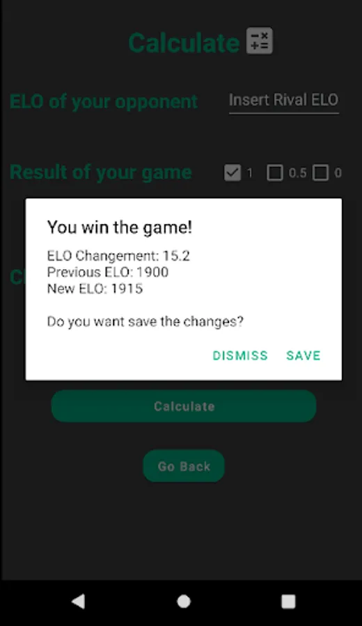 - Calculate chess rating variations and save it in your phone (or discard it)