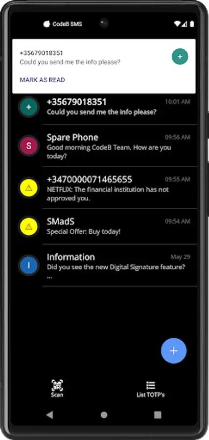 CodeB TOTP SMS prioritizes your peace of mind. Every SMS you receive is diligently scrutinized against remote DNS blacklists. Dangerous links are automatically deactivated by our app, safeguarding you and your device from potential hazards.