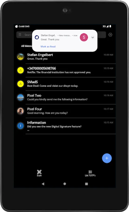 Welcome to CodeB TOTP SMS - an innovative game-changer in the realm of Android messaging apps. This is not just a text messaging app, but an all-inclusive solution that amalgamates sophisticated SMS security with an integrated TOTP (Time-based One-Time Passwords) authenticator.