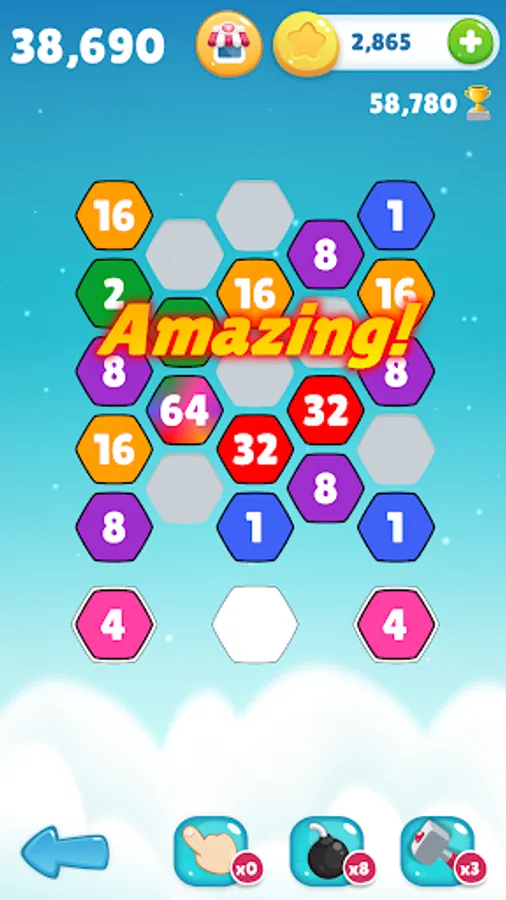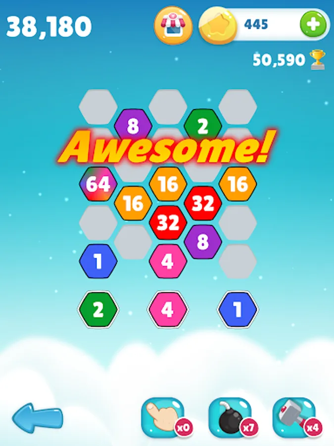 • Block match 3 puzzle game: match numbers to merge the hexa tiles.