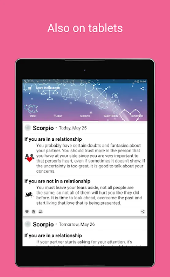 It contains predictions for all 12 zodiac signs: Aries, Taurus, Gemini, Cancer, Leo, Virgo, Libra, Scorpio, Sagittarius, Capricorn, Aquarius and Pisces.