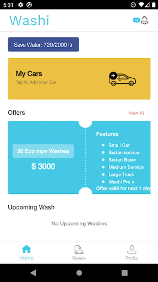 Wash® is an App, which uses mobile devices to order the cleaning of your cars. It allows you to save essential information about your car, such as plate, color, model and even upload a photo to be found easier in the required location of the service, by those who will apply the service. Within the application you will find the offers and the washing categories that are allowed, likewise Washi® has a saving count in the water every time a service is registered.