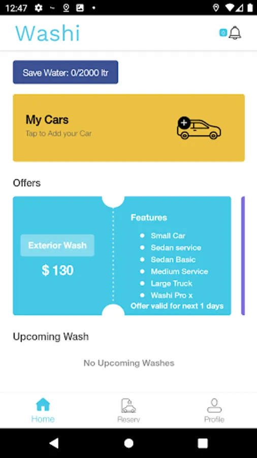 Wash® is an App that uses mobile devices to order the cleaning of your cars. It allows you to save the essential information about your car, such as license plate, color, model and even upload a photo to be able to be found easier in the required location of the service, by those who will apply the service. Within the application you will find the offers and the washing categories that are allowed, likewise Washi® has a water saving count each time a service is registered.