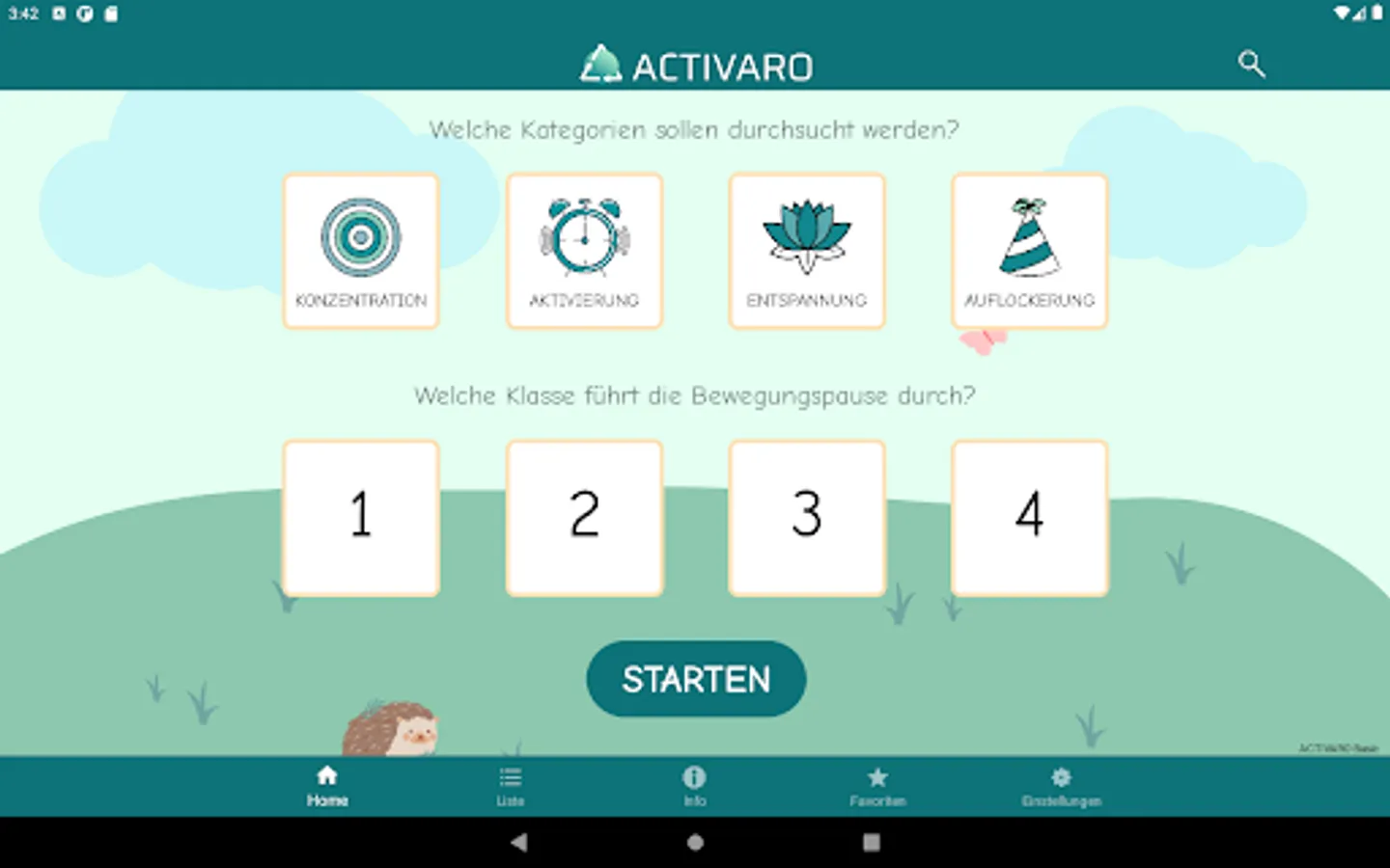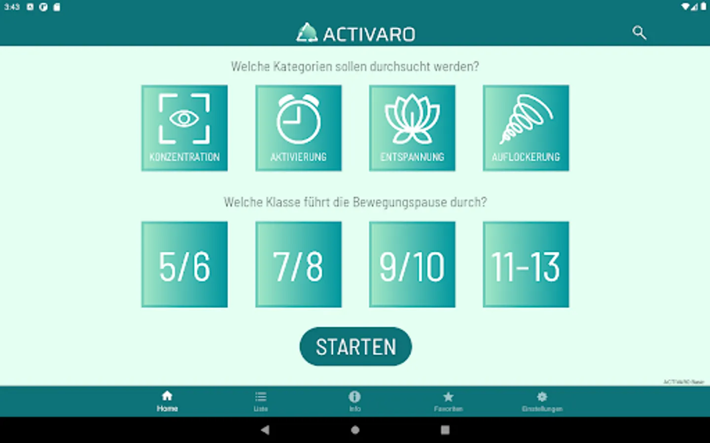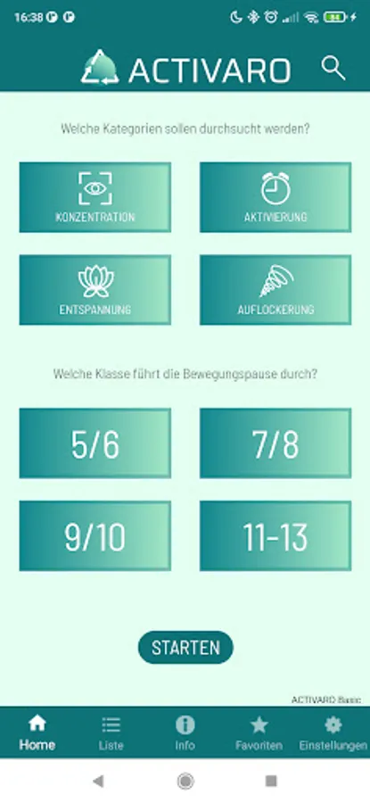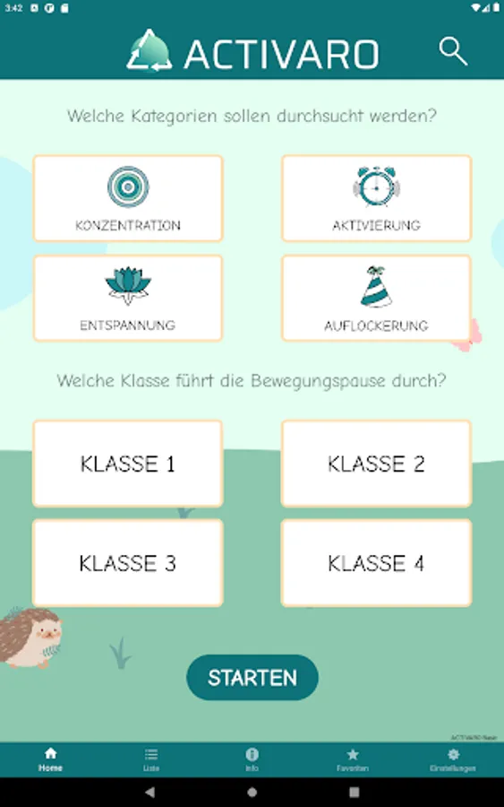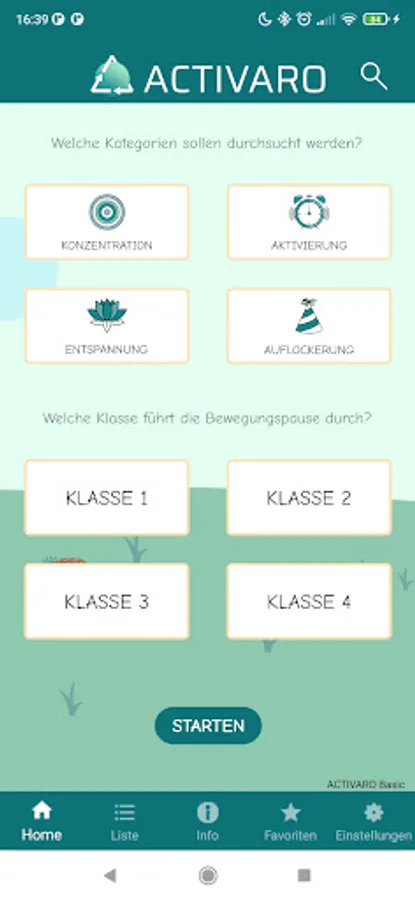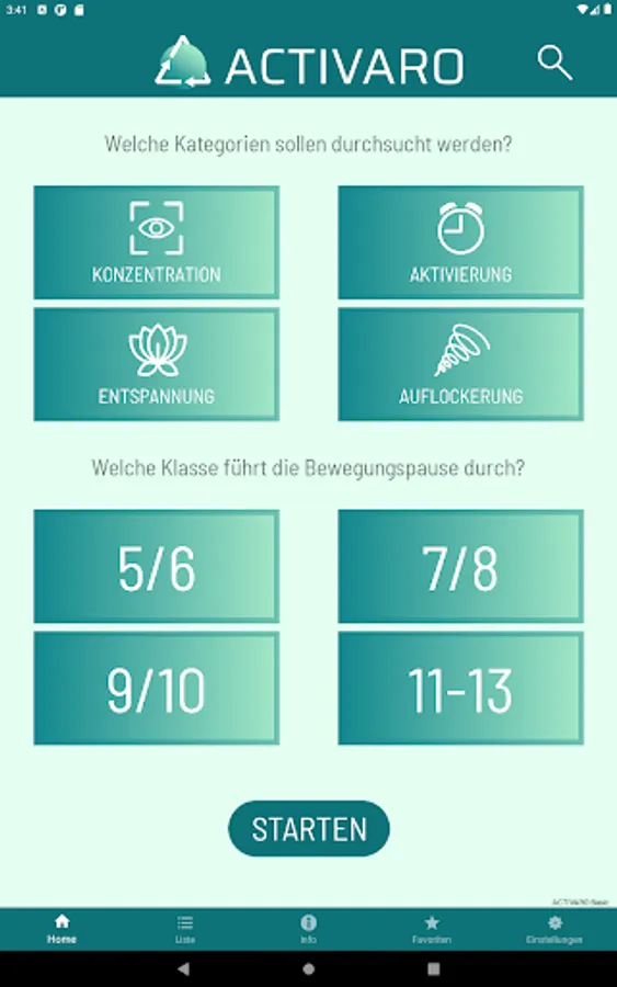 Movement breaks can serve to compensate for the stress of everyday school life, which is mainly completed sitting. In the ACTIVARO app, users can filter exercises according to four categories. Alternating between the different focus areas is recommended.
