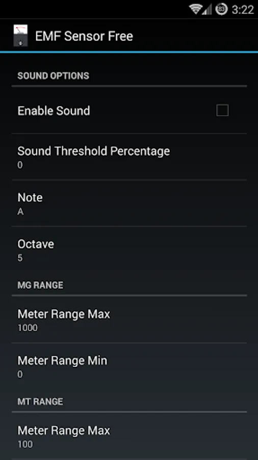 Custom color values can be set for the text. Sound can be enabled and customized in preferences, default is off. This will play a tone at a rate determined by the EMF reading, similar to a Geiger counter.