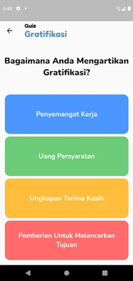 This application was made by UPG Assistant BKD Boyolali in the context of preventing corruption through identification of gratuities received by Civil Servants and State Administrators and the wider community. With this application, BKD Boyolali is committed to maintaining the principles of good governance and implementing gratuity control for the sake of realizing quality and integrity organizational governance.