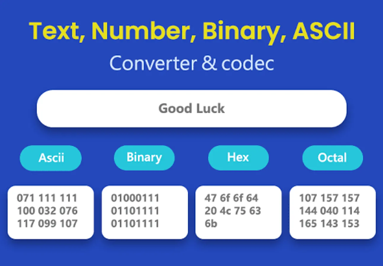 - Binary (ABCD → 01000001 01000010 01000011 01000100)