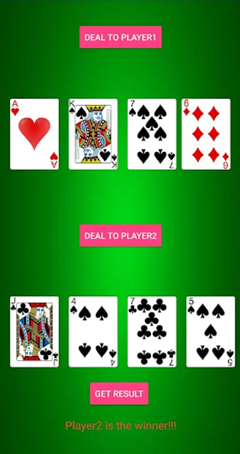 multiplayer: this application deal to two players where each one hase the 4 possibility by hiting the 'deal to player' button and after that you'll be able to see who is the winner by hiting the 'get result' button.