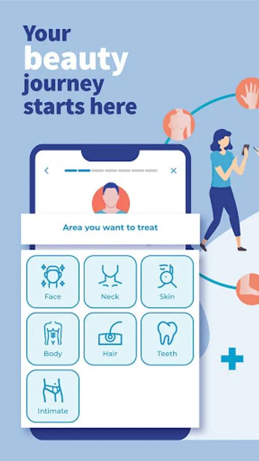 Each Journey in MeTime begins with your selection of areas. These include face, neck, body, skin, hair, teeth, and intimate. Within each area you can select specifically what region you want to improve, correct or enhance. For example, within the face area you can choose eyes, nose, cheeks, face shape, and many more. Within body you can choose tummy, thighs, breasts, hands, feet, for example. You can also select skin, hair restoration or removal, teeth restoration, and treatments for intimate areas for women and men.