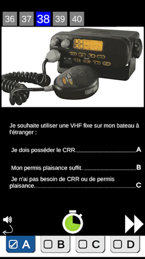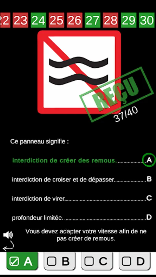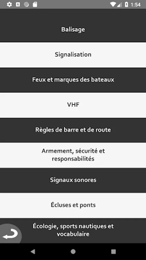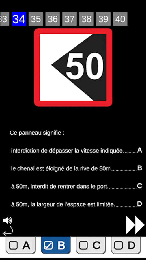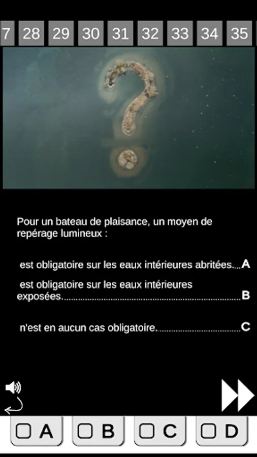 The questions conform to the official program and simulate as closely as possible the real conditions of passing the theoretical exam for the pleasure boat license, inland waters option, thanks to an interface recreating the remote control used during the official licence.