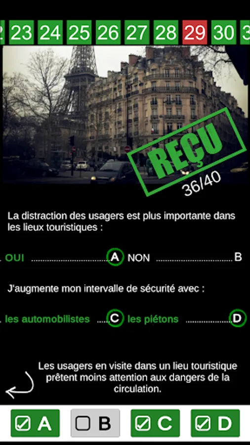 A review mode allows you to learn the theory and prepare for the ETM test, by going back on your mistakes.