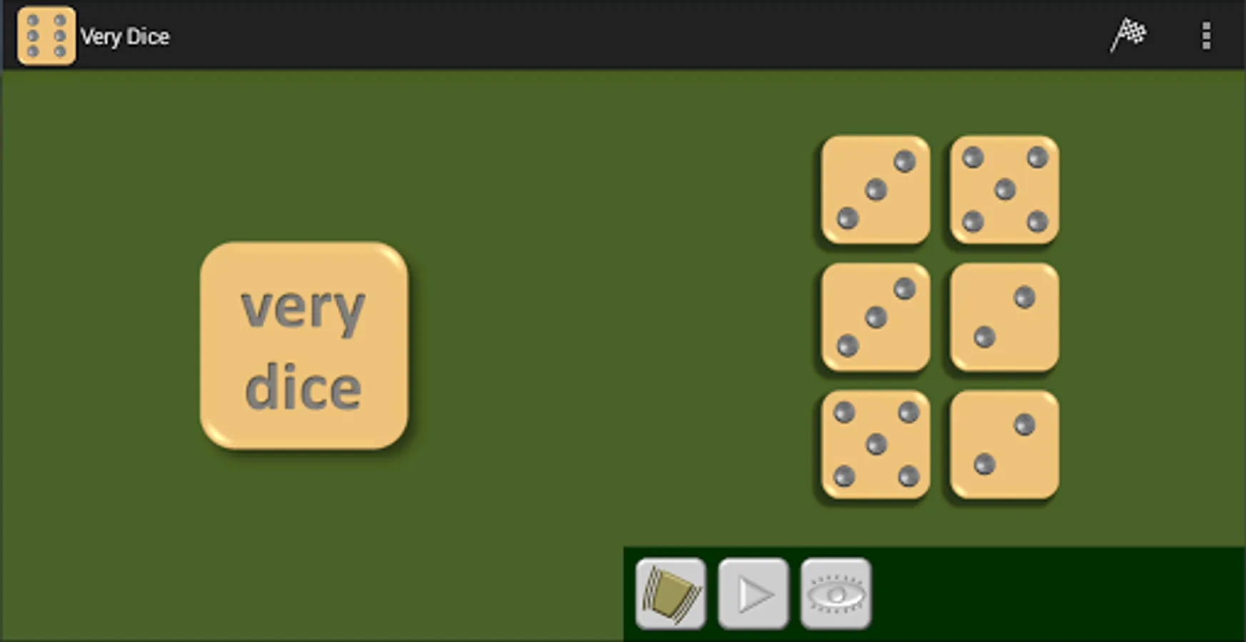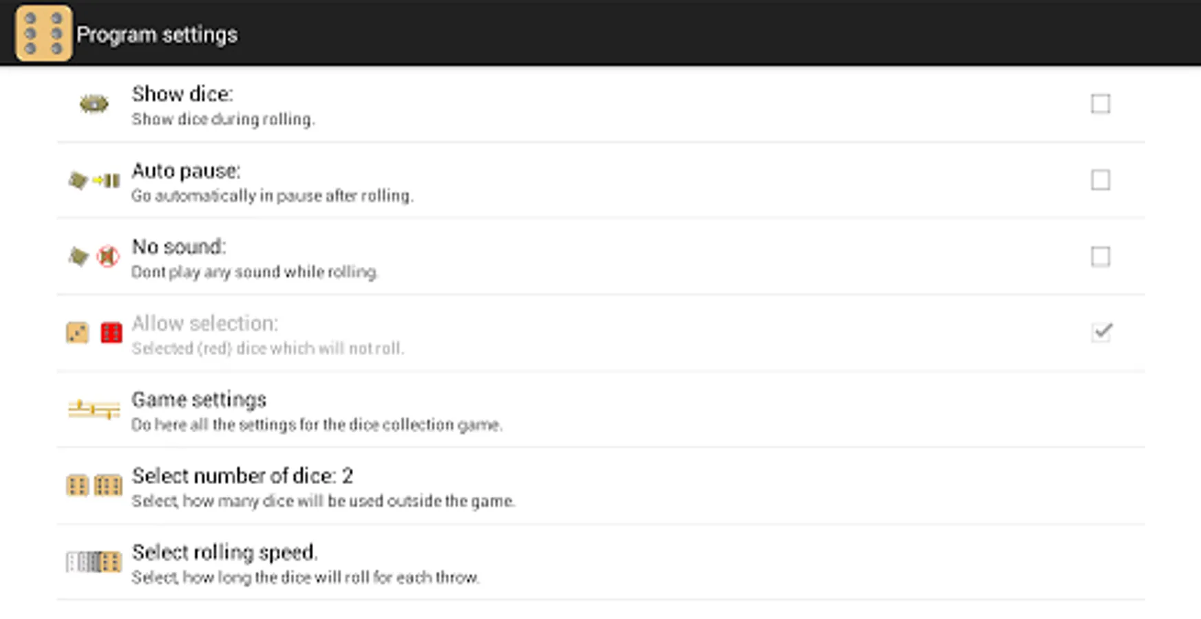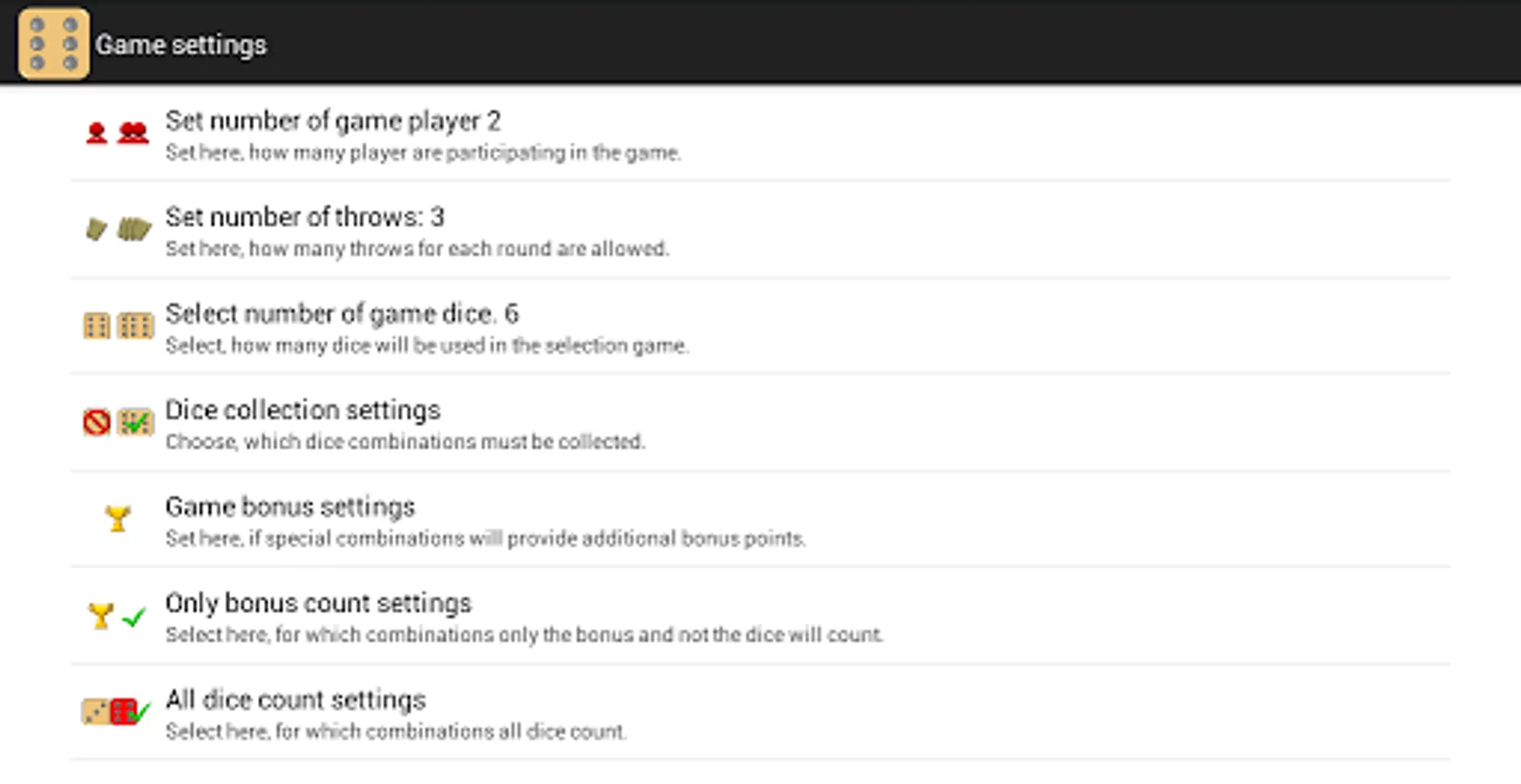 With this program you can just roll the dice, roll them in a hidden mode or you can play a collection game. This can be done with up to 6 dices. The game is completeley configurable (which dice combinations can be selected, how many points are provided for which combination and how many throws for each round are allowed). The game can be played with up to 6 player (on one device) - but here a tablet is recommended - on a phone the game is usually played in a single mode. A reset button allows you to put the settings to the default values