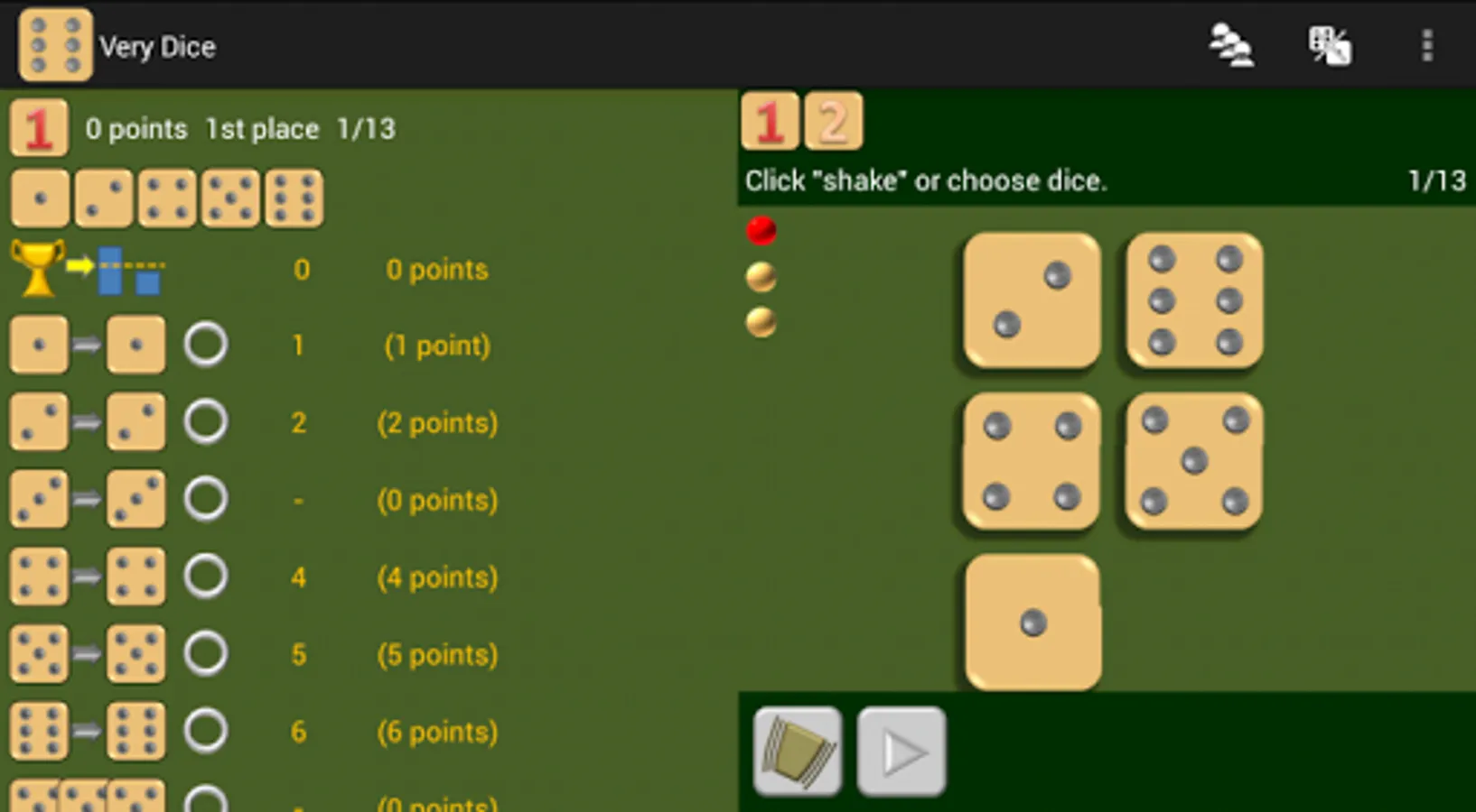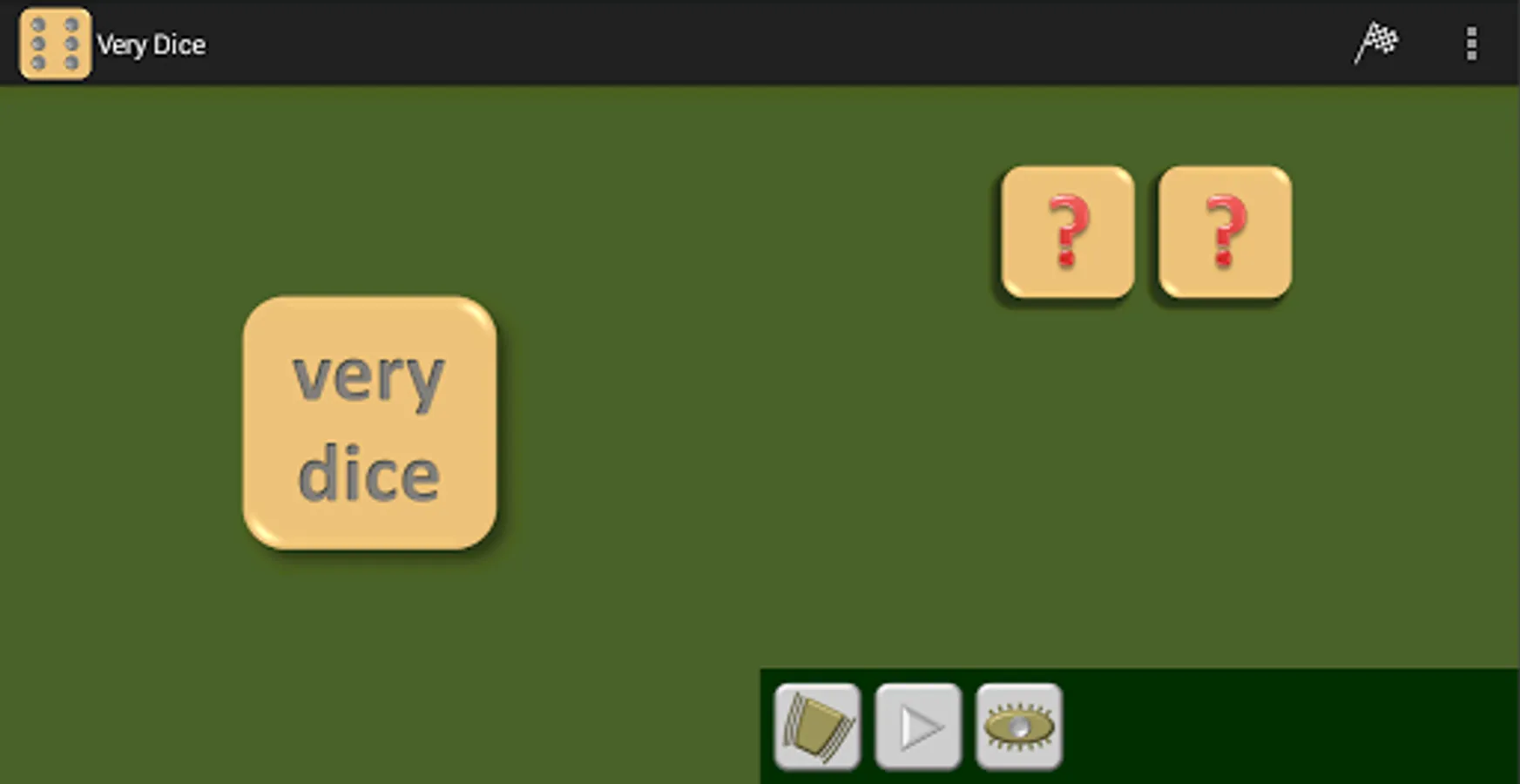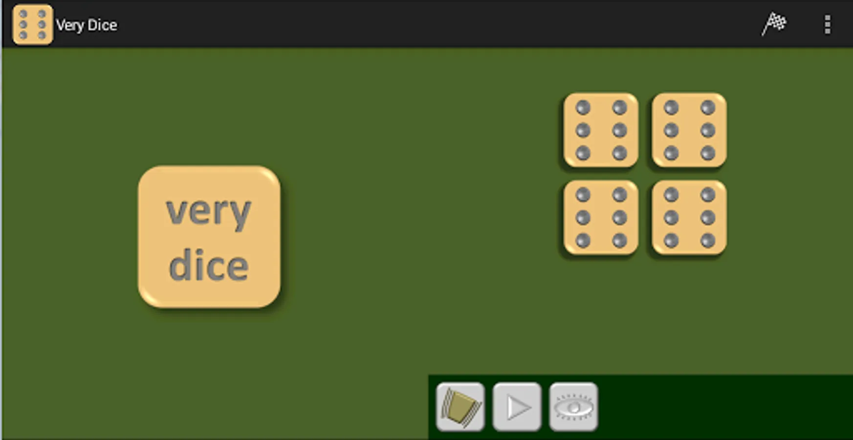 With this program you can just roll the dice, roll them in a hidden mode or you can play a collection game. This can be done with up to 6 dices. The game is completeley configurable (which dice combinations can be selected, how many points are provided for which combination and how many throws for each round are allowed). The game can be played with up to 6 player (on one device) - but here a tablet is recommended - on a phone the game is usually played in a single mode. A reset button allows you to put the settings to the default values
