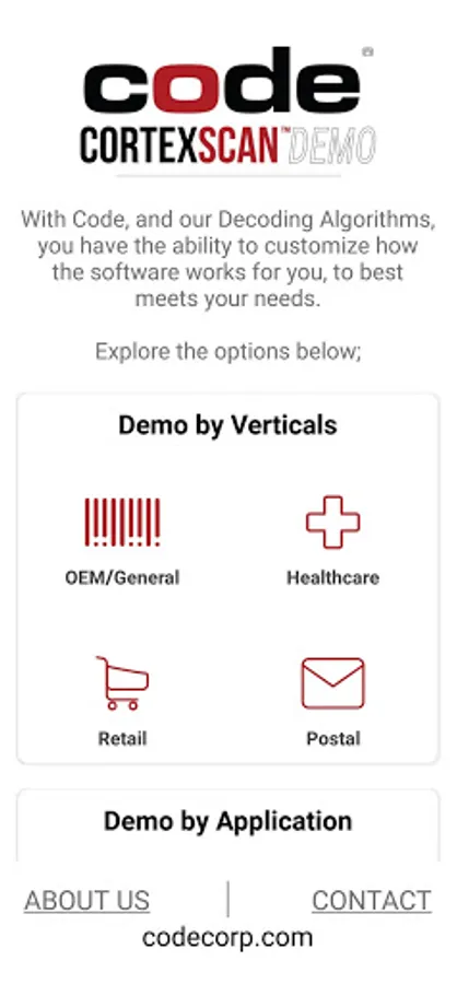 Evaluate this demo app and then contact Code Corporation for more information using the Contact Us button within the app.
