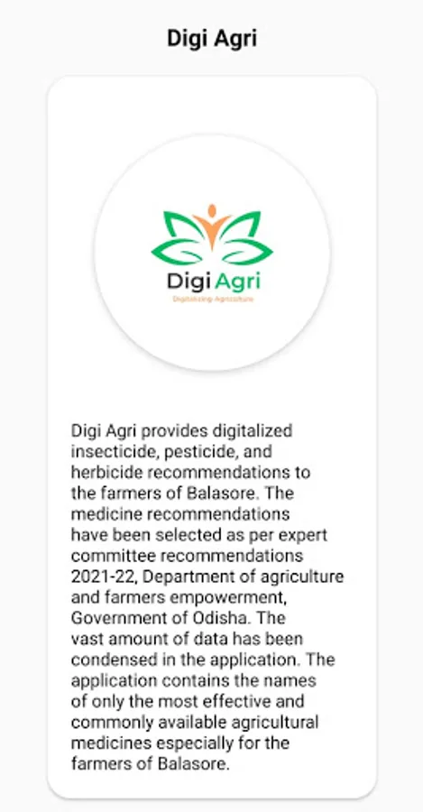 Digi Agri provides accurate government-certified information about agricultural medications. The app has been primarily created to help the farmers of the Balasore District, Odisha, India.