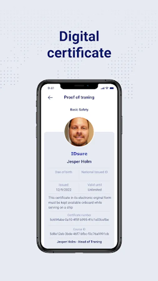 Digital certificates are the future. The IDsure App guarantees irrevocable ID verification, Issuing and registration of certificates, 100% digital, cloud-based, real-time up to date data. Third Party stakeholders i.e. Port State Control or a crew manager can verify the validity & authenticity with a few clicks.