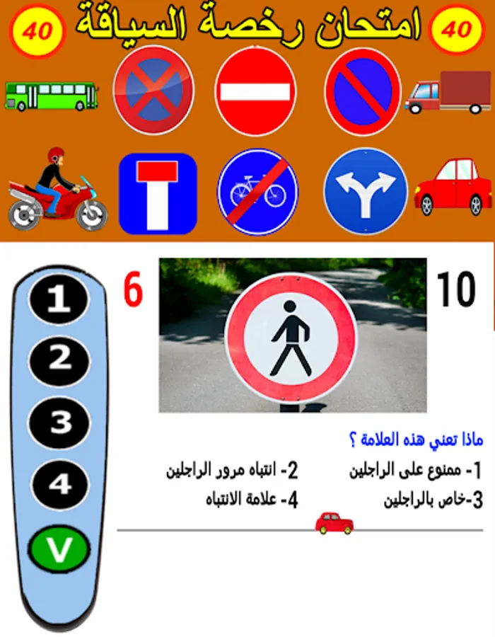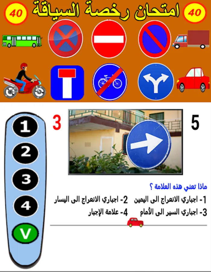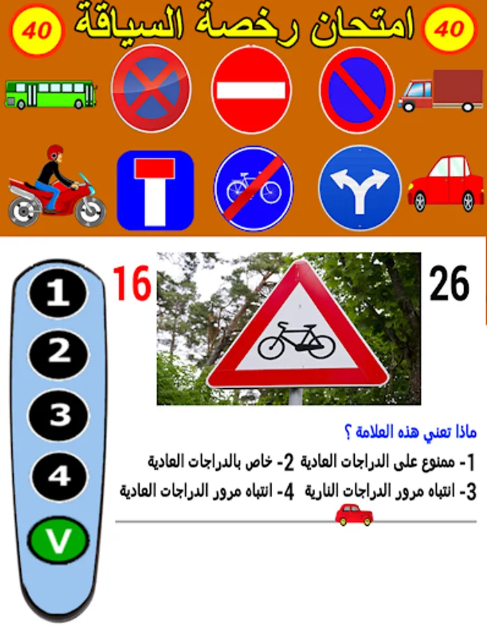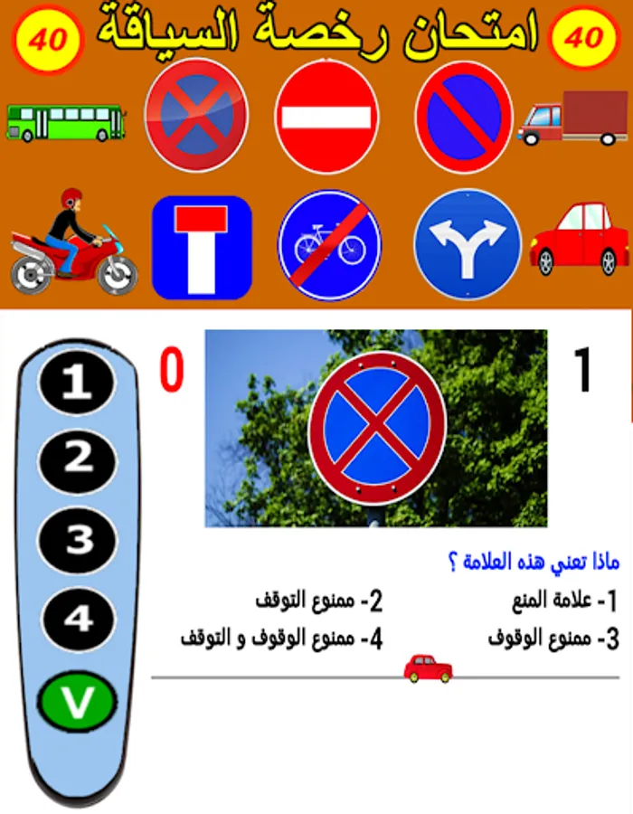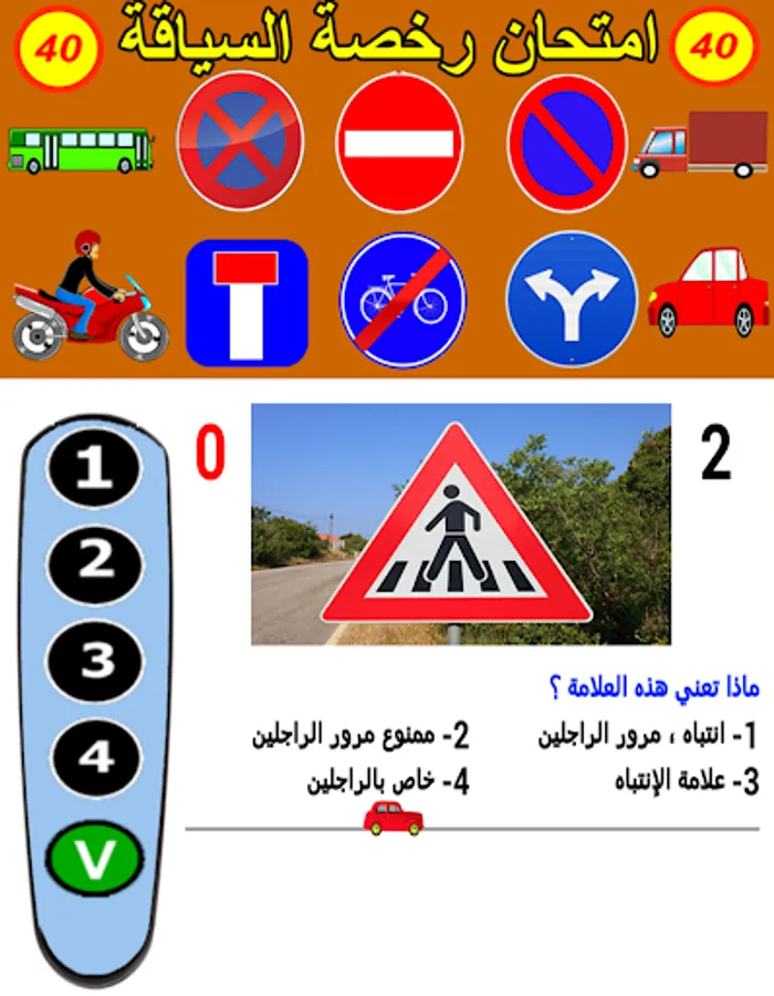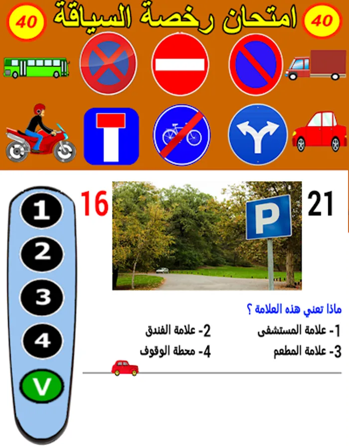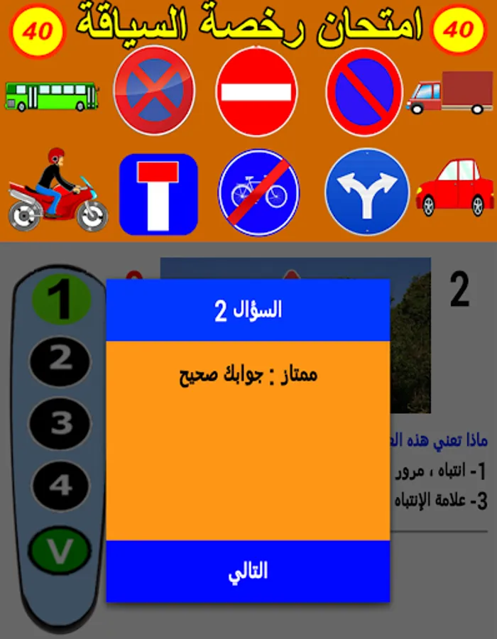 The application is displayed in the form of questions and answers content, where you start watching the traffic sign and read the question and understand very well - Duration 20 seconds - and then, go directly to the 40 questions answered any question after question ...