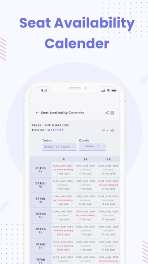 => check seat availability between two point and know about availability how many seats are reaming. waiting list and the confirmation chances. Tatkal seats available or not