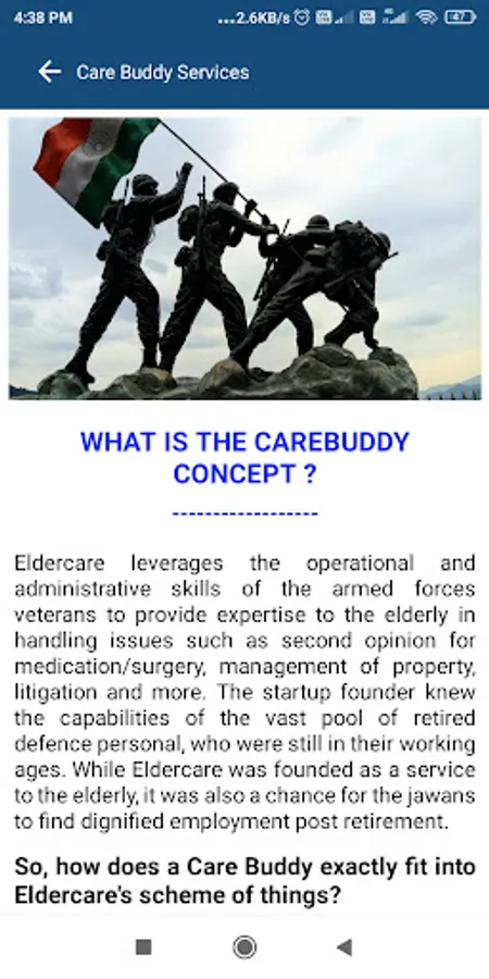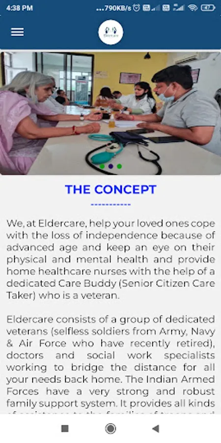 We are an organization with Head Quaters at New Delhi and branches at Bengaluru, Punjab, Chandigarh, Haryana and Uttarakhand. We promise one stop solution for Elderly Care and assisted living. Eldercare uses Human intervention, a Care Buddy, along with technology to deliver the services. Care Buddy is an Indian Armed Forces Veteran. By virtue of training and inbuild ethos, a Care Buddy, brings in trust, capability to work flawlessly in time of Crisis and above all the selfless devotion to assigned duties.