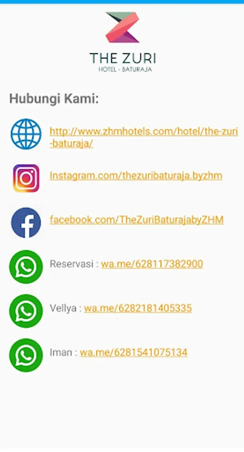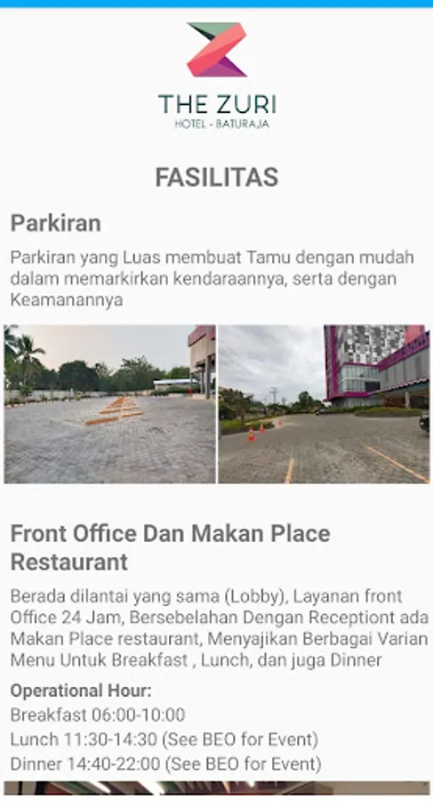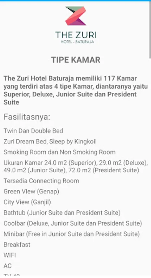 This application was created to make it easier to find information about The Zuri Hotel Baturaja