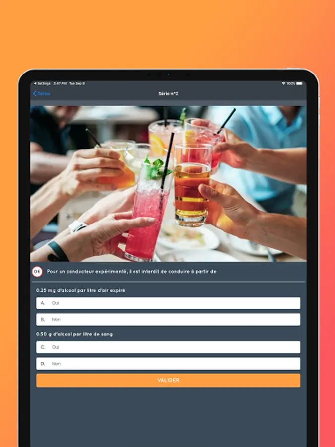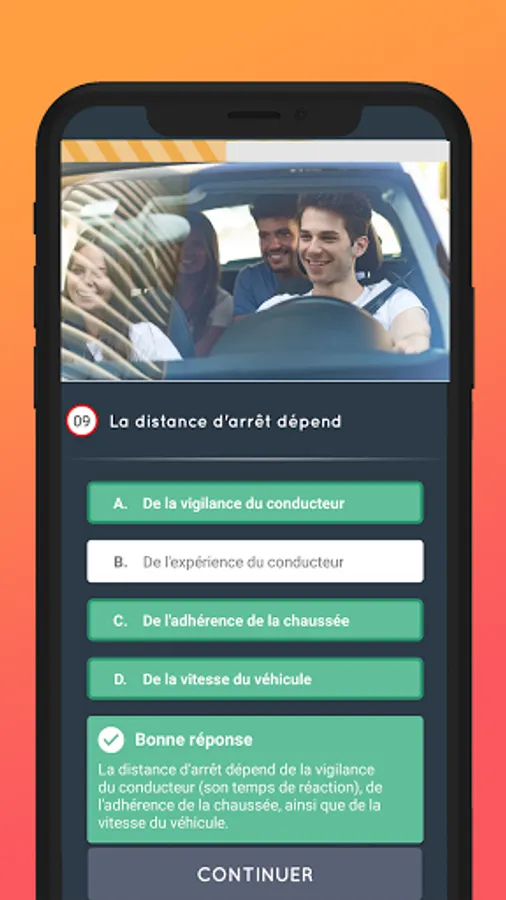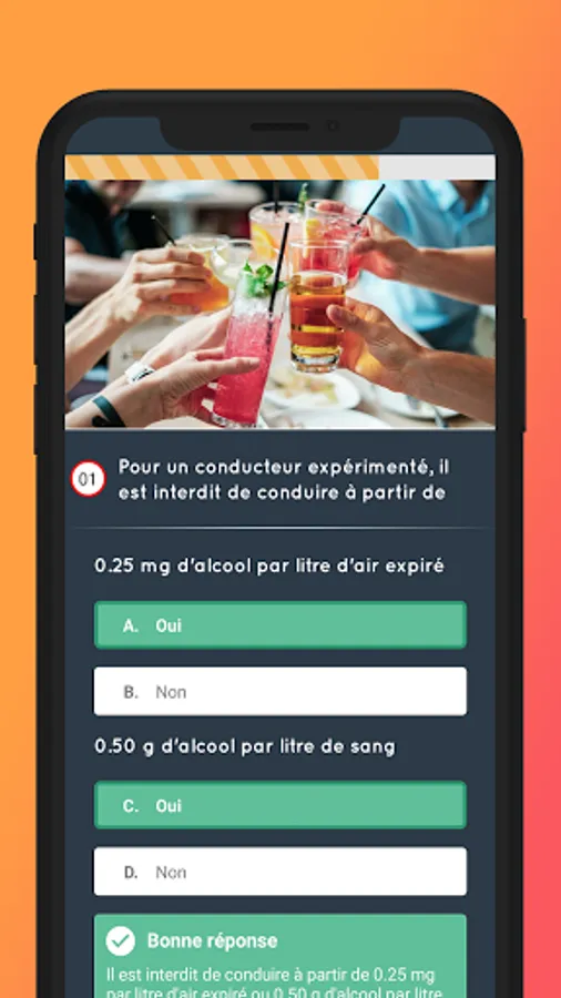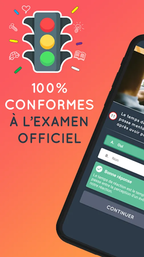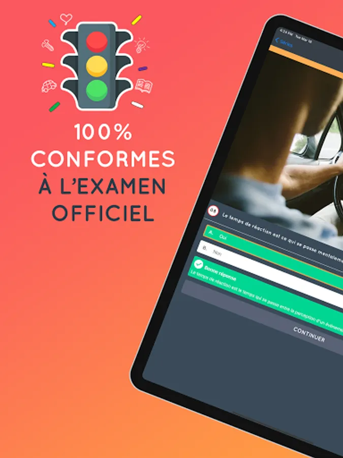 An application with questions similar to the official exam, focusing on the 10 official topics of the Highway Code: Road Traffic, Drivers, Roads, Other Users, Miscellaneous Concepts, First Aid, Taking and Leaving vehicle, mechanics and equipment, passenger and vehicle safety, the environment