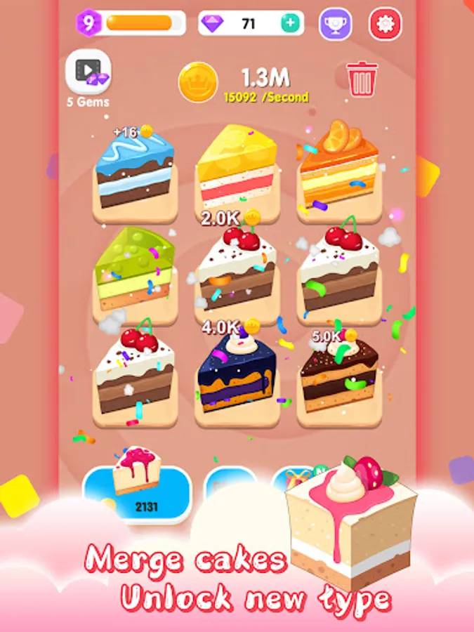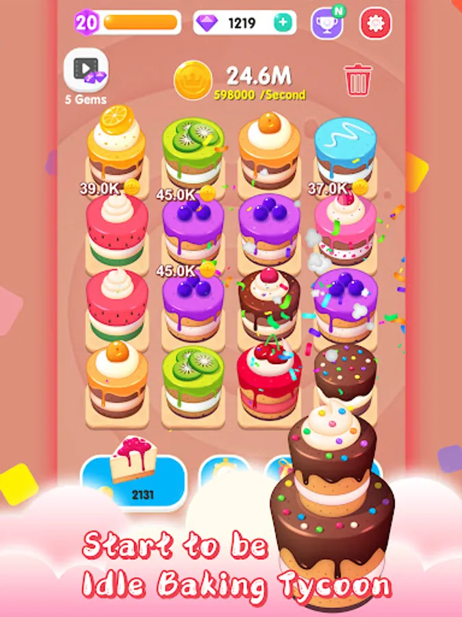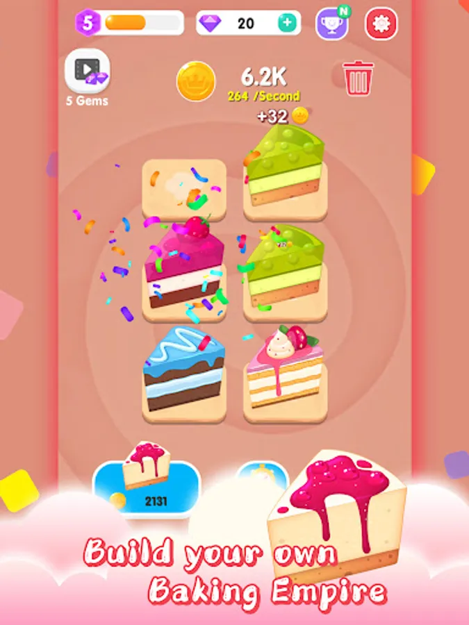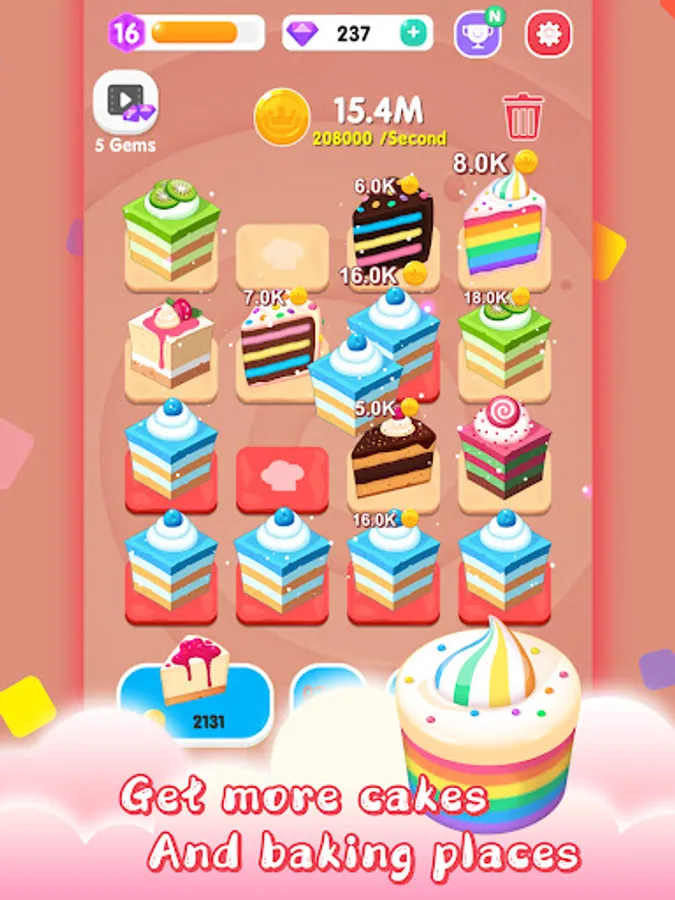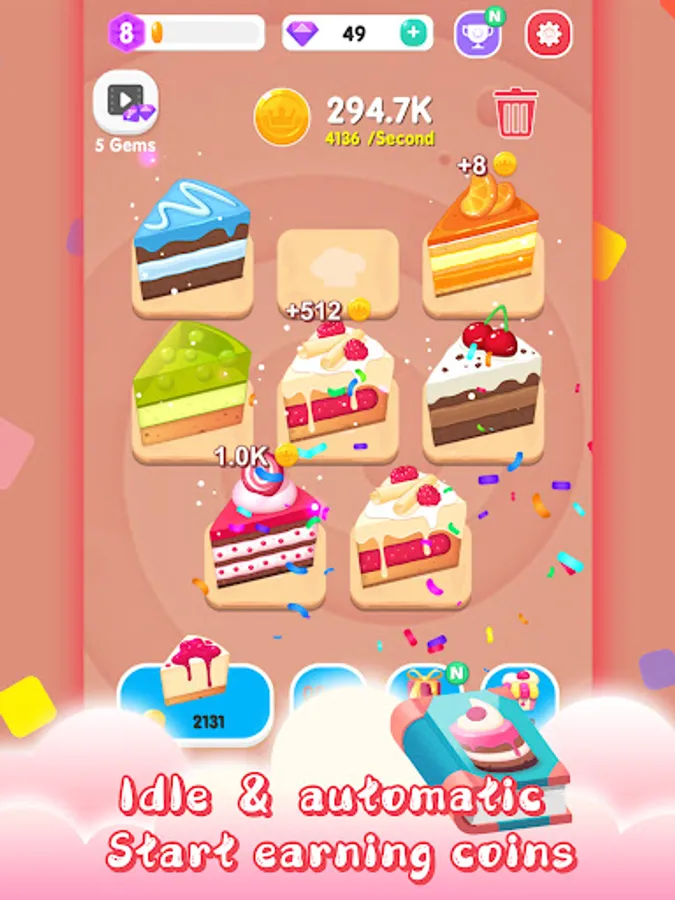 All cakes in plate will get incoming automatically. You need to merge them to get more incoming. And then you are on your way to build your baking empire now. Remember to fill all the plates with cakes! Unlock all kinds of cakes now, build your own baking store and become idle baking tycoon!