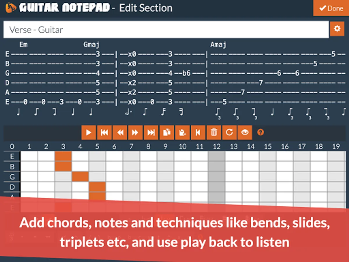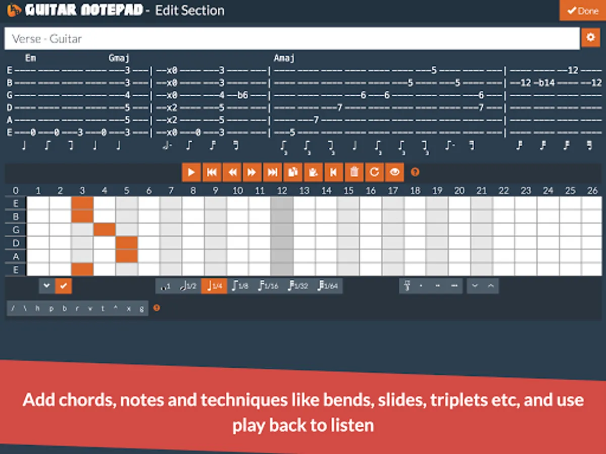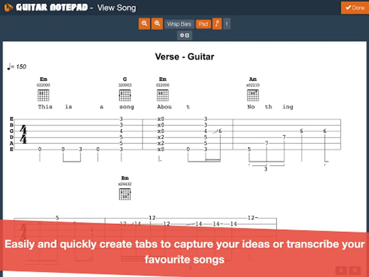 - Add chords, strum patterns and lyrics above your tabbed notes (no other apps I've seen support this!)