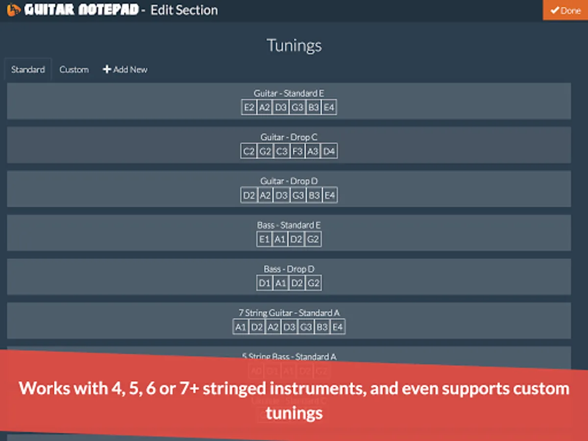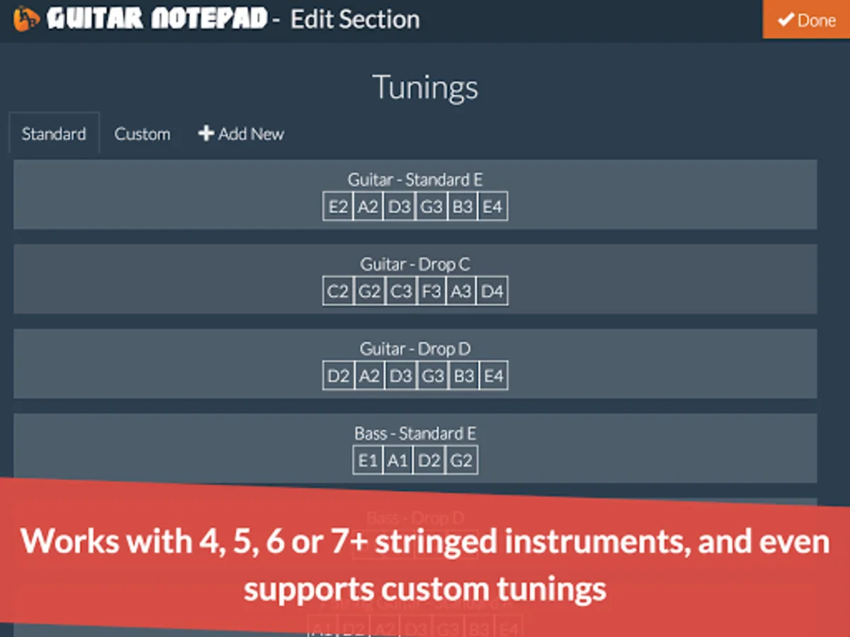 - Add any number of strings and custom tunings including 4,5,6 and 7 string guitars/bass guitars
