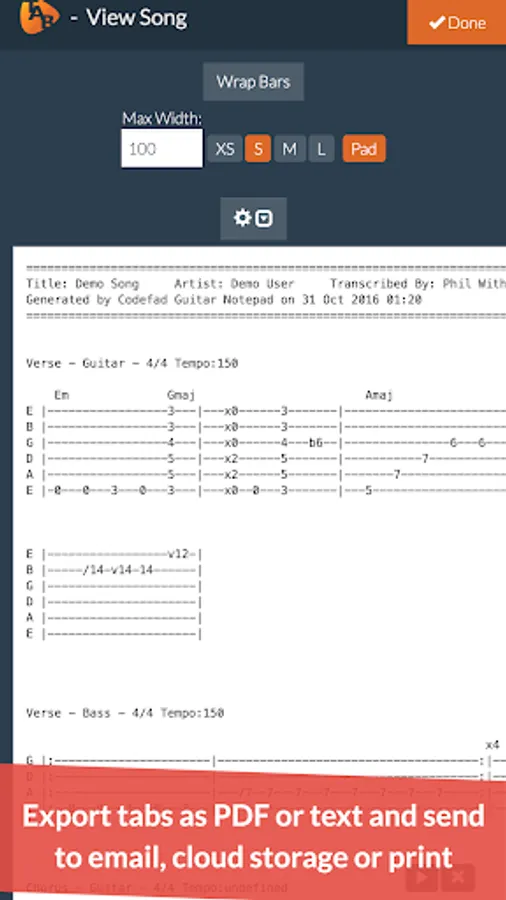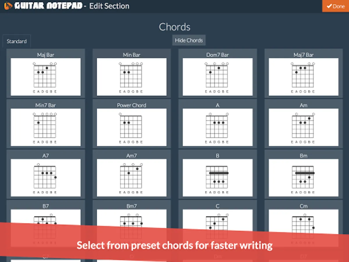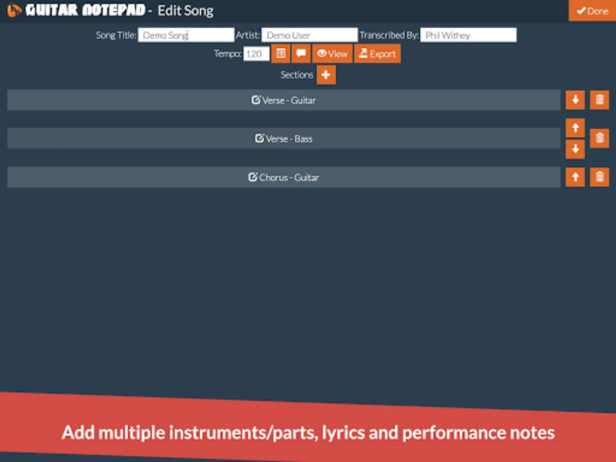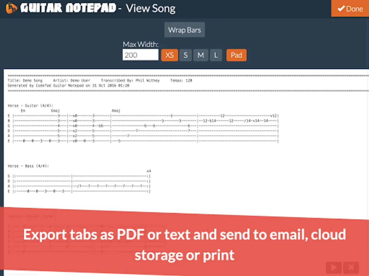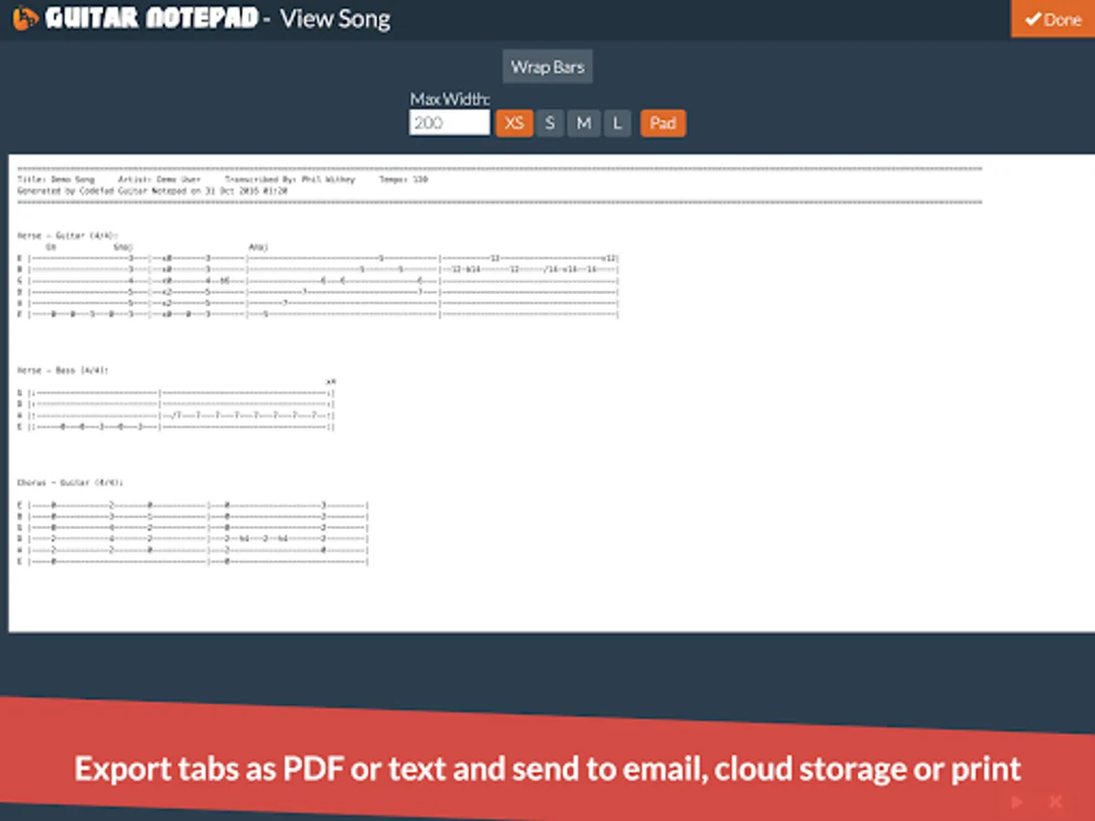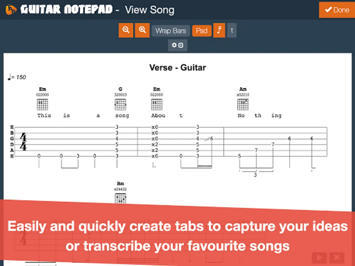 Guitar Notepad helps you easily and quickly jot down song ideas in guitar tab, save them to the cloud and email them to band mates.