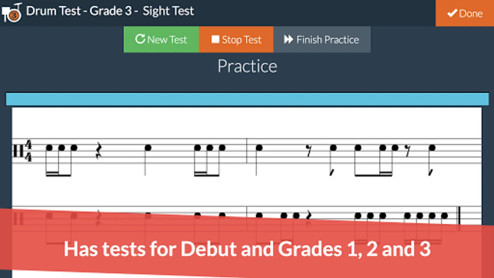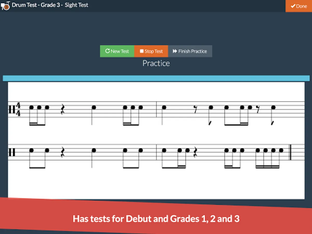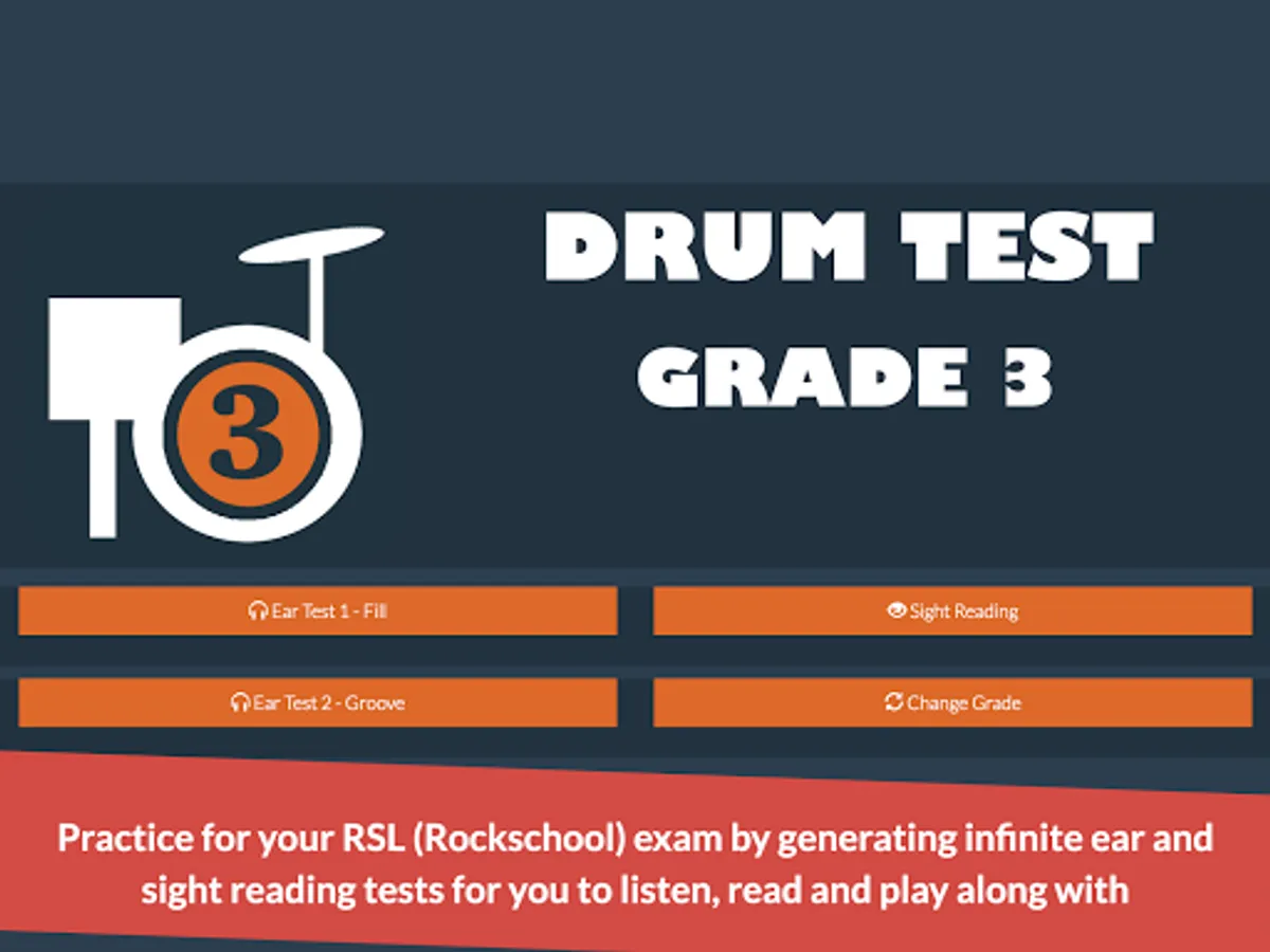Practice for your RSL (Rockschool) Grades Debut, 1, 2 and 3 drum kit exams. This useful app will generate ear and sight reading tests for you to listen, read and play along with in preparation for your exam.