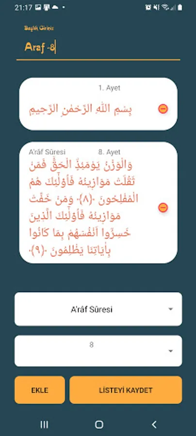You can read the verses you want from the Quran regularly by selecting them as vird.