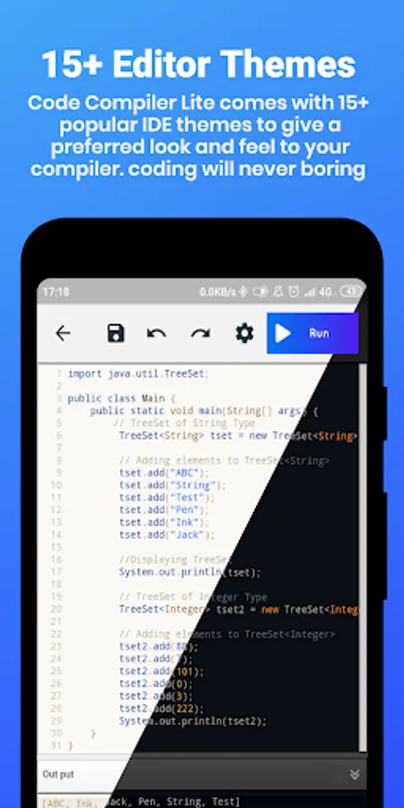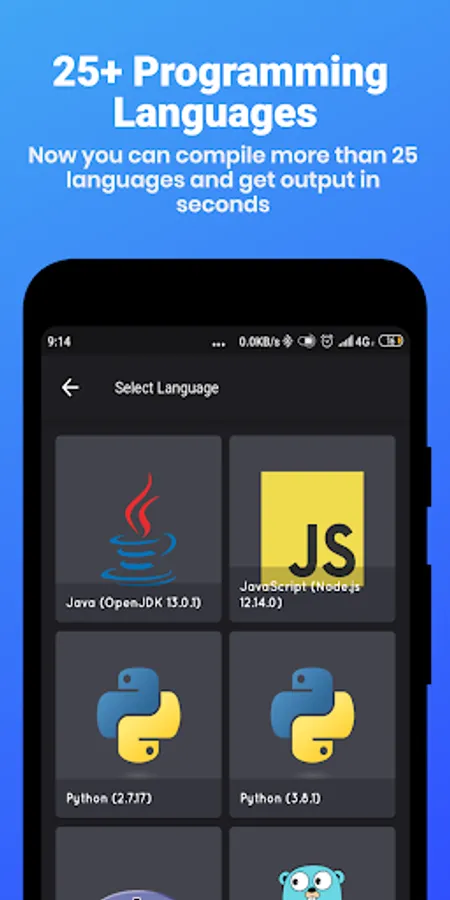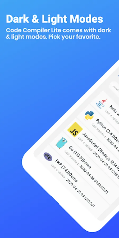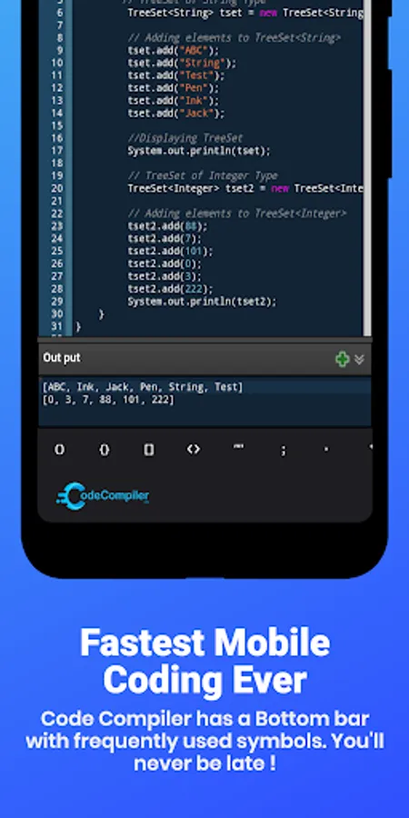 Code Compiler Lite supports more than 30 Languages. It comes with a user-friendly simple design and also with developer s’ favorite Dark & Light mode with 15+ themes to provide the best user-preferred look and feel that mobile compiler can provide. The bottom bar of frequently used symbols makes coding easy. And with the fastest compilation and execution of the code saves your time and effort that can spend on your coding process increasing the active and effective time of coding.