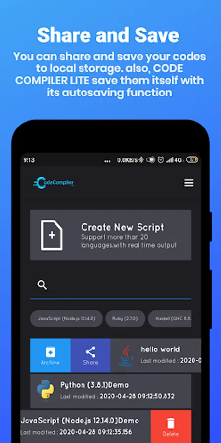 With the Code Compiler Lite, you can save your code snippets to local storage or you can share it with your friends. And with the auto-saving function, you’ll never have to be aware of saving your codes.