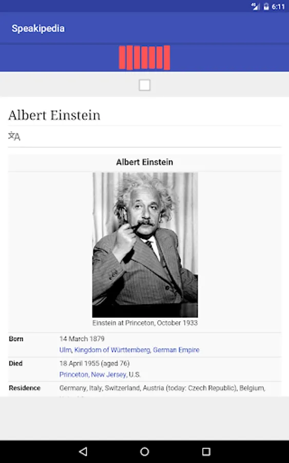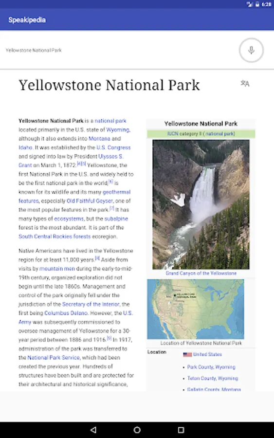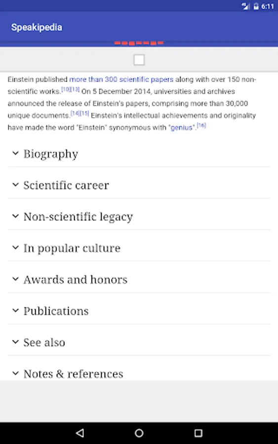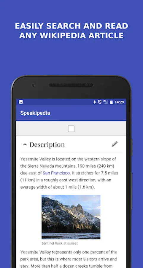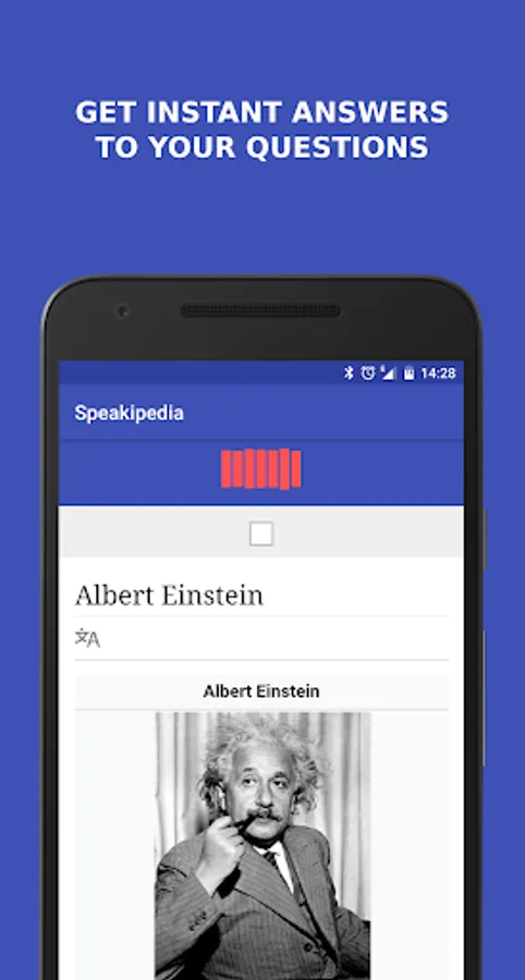 With a voice-enabled search you don't need to type to search articles, just ask Speakipedia, the app will read the article's content using text-to-speech capabilities of your android phone.