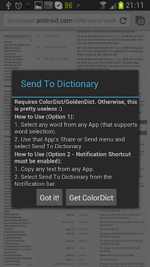 Look up words in a dictionary from a browser or other apps instantly without copy-paste like a real natively integrated dictionary app.