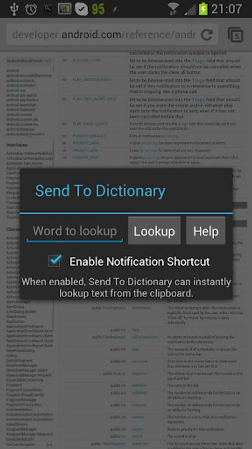 2. (NEW) Clipboard text lookup - copy text from anywhere and select Send To Dictionary from the Notification Bar. Meaning it can now work with apps like iSilo and other apps that don't have send/share function!