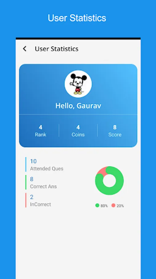 - User Statistics: Users can see Rank, Coins, Scores, Attended Questions, Correct answers, and incorrect answers.