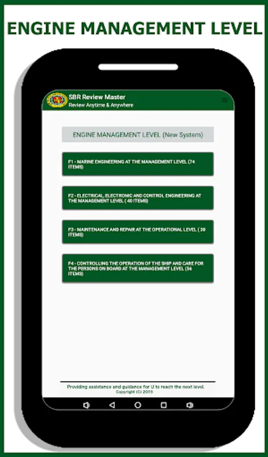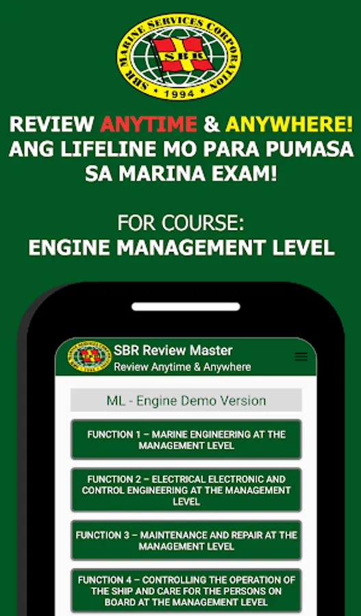 SBR Marine Services Corporation's newly improved offline review app made for Marine Engine Officers (Management Level). It's the updated and separated app from our previous All Ranks Review Master mobile app. The contents are now merely for Engine Management Level.