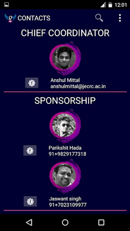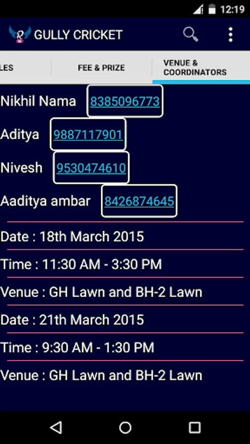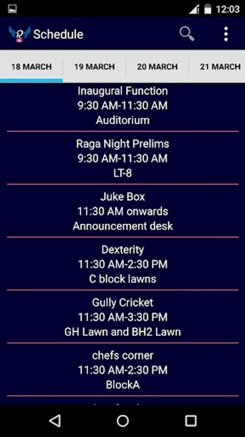 - Venue and time of every event placed along with Rules,Description and contact details.