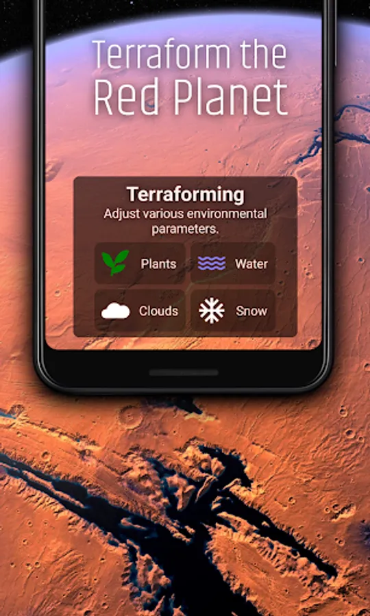 Welcome to Mars! Terraform the Red Planet - Your ticket to the world of interplanetary creativity! Design your own planet Mars, just the way you imagine it. With our easy-to-use controls, you can effortlessly adjust the water level, vegetation, cloud cover, and ice distribution to create your own unique planet.