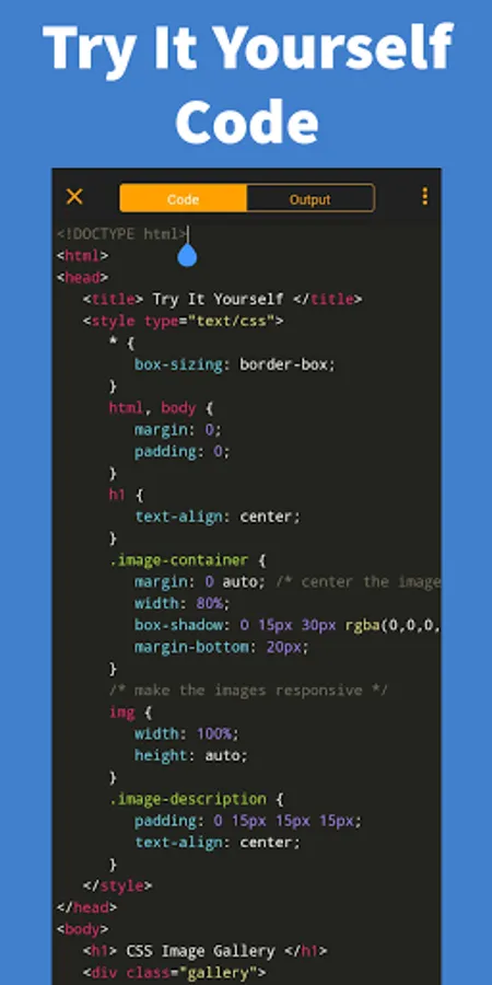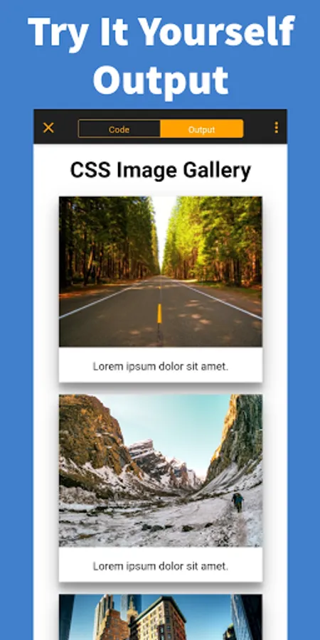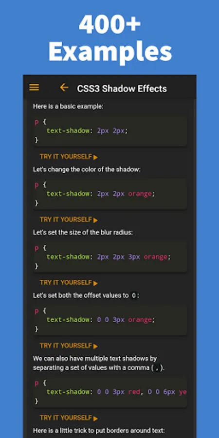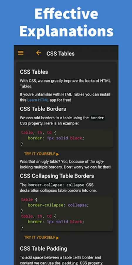 In every lesson, there are explanations, examples with the Try It Yourself functionality that help you effectively learn to code CSS.