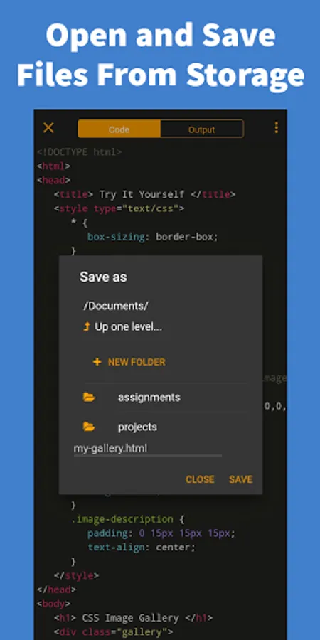 4. Code Playground/Editor with syntax highlighting and additional keyboard keys that allow you to open and save files from your local storage.